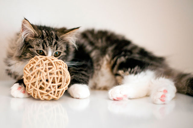 ネコちゃん用のラタンボールはシンプルに丸く編み上げたボールの中に金属製の鈴が入っています。