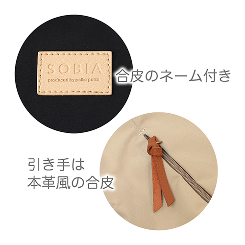 ファスナーの引き手には、高級本革の質感に近い合皮を使用。
