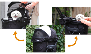 お散歩では愛犬が景色を楽しめるように前面を開けたり、
